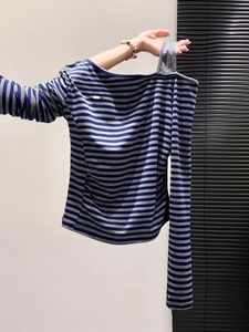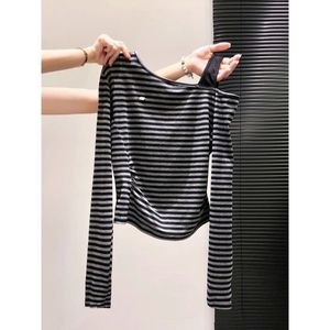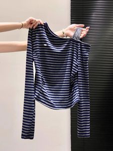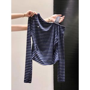条纹斜肩长袖T恤女早秋季新款辣妹修身显瘦不规则设计感打底上衣
