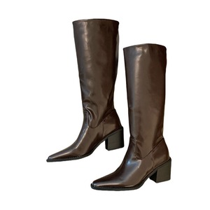 小方头不过膝粗跟长靴女棕色小个子高跟油皮骑士靴显高套脚高筒靴