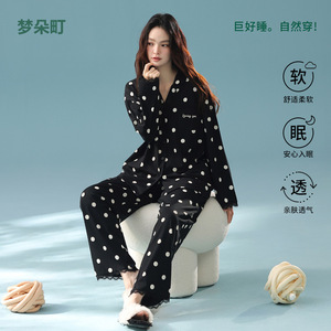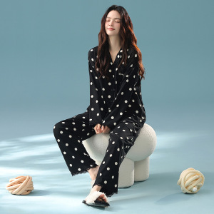 【抗菌莱卡棉】新款女士睡衣纯棉长袖秋冬季黑色波点家居服睡衣女