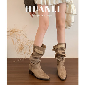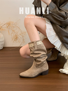 "美式慵懒"复古褶皱堆堆靴女秋冬尖头西部牛仔长靴粗跟中筒骑士靴