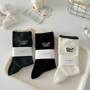 早秋新款韩系春秋袜子女韩版刺绣字母ins潮撞色袜口百搭中筒棉袜