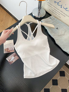 美式辣妹U领工字背心带胸垫内搭外穿双肩带交叉露背运动打底上衣