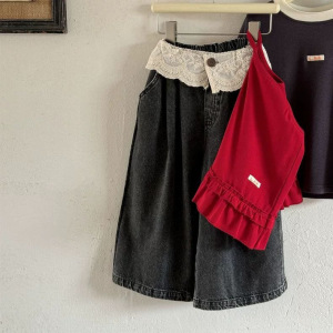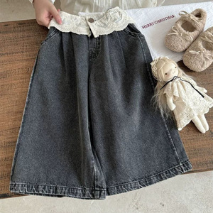 女童森系宽松洋气蕾丝花边屁帘牛仔裤直筒阔腿裤秋季新款韩版长裤