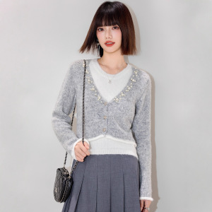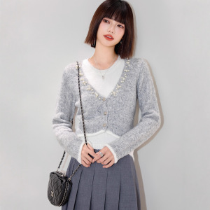 温柔风韩系假两件撞色拼接针织衫女秋冬气质慵懒重工钉珠圆领毛衣