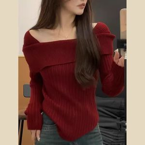 欧货气质高级感打底衫女春秋新款毛衣修身灰色针织衫一字领上衣潮