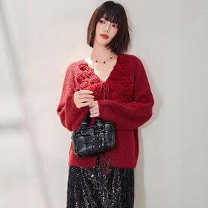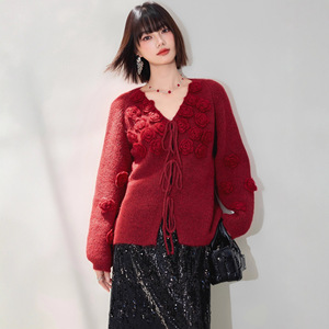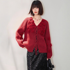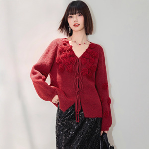 高级感红色玫瑰v领长袖针织衫女秋冬季慵懒风毛衣设计感抽绳上衣
