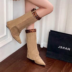 牛皮版~尖头坡跟豹纹库管靴辣妹复古西部牛仔靴显瘦皮带扣中筒靴