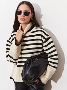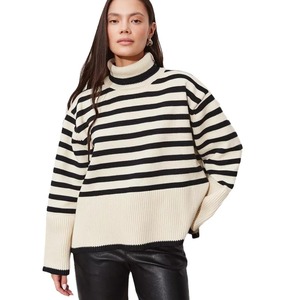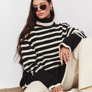 跨境高领条纹针织衫女上衣2025欧美秋冬新款宽松气质套头毛衣女