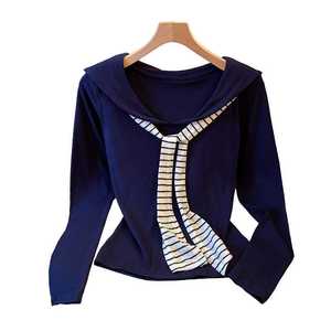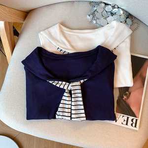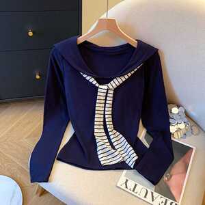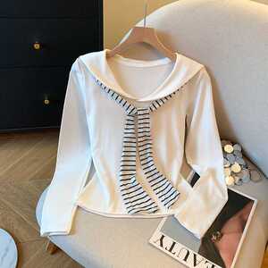 长袖T恤女2025新款秋季学院风海军领条纹飘带修身上衣