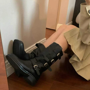 牛皮版~韩系皮带扣中高筒骑士靴女2025新款秋冬季粗跟长筒靴女靴