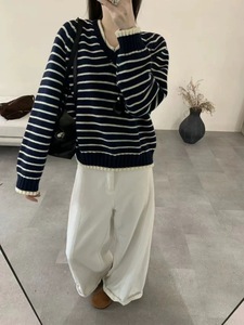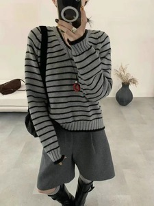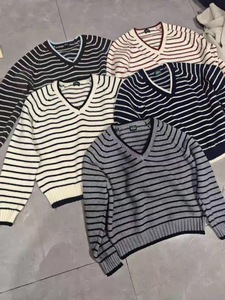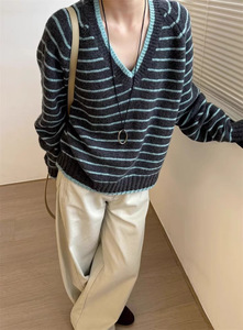 韩系条纹撞色V领针织套头衫秋冬新款时尚百休闲百搭毛衣上衣女