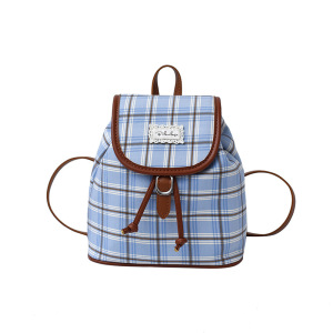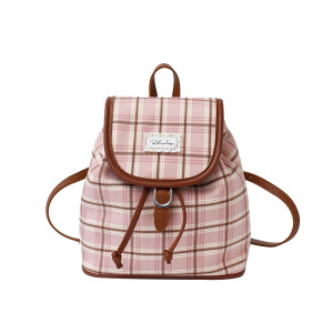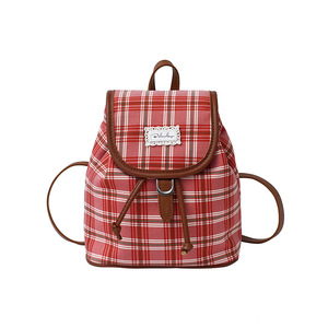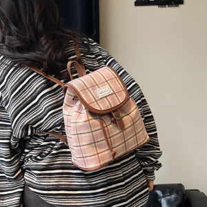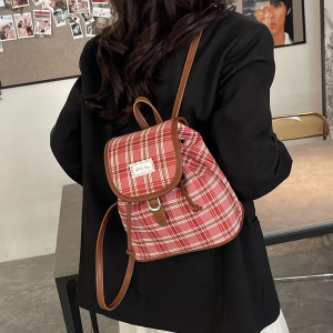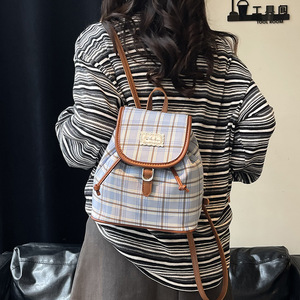 格子帆布双肩包女休闲百搭学生上课书包水桶包高颜值轻便旅游背包