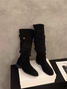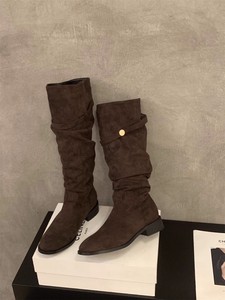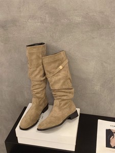 韩系2025秋季新款复古尖头瘦瘦绒面褶皱堆堆靴高筒长靴女骑士靴子