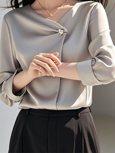秋季新款今年流行漂亮小衫别致轻奢感超好看灰色醋酸缎面衬衫早秋