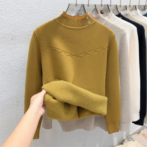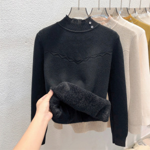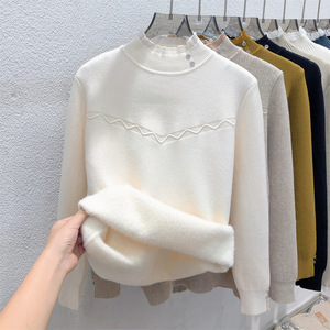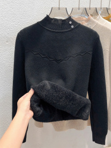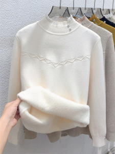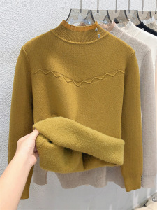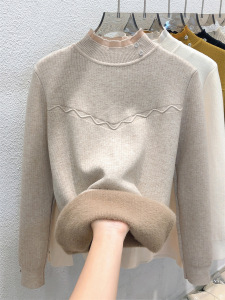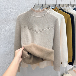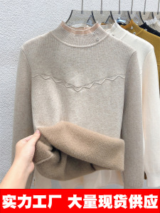 一体绒面料 加绒加厚毛衣女士半高领蕾丝针织打底衫2025新款内搭