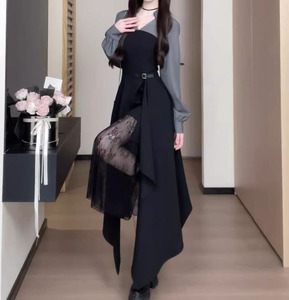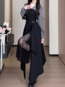 早秋流行长袖衬衫裙蕾丝拼接不规则长裙假两件连衣裙女