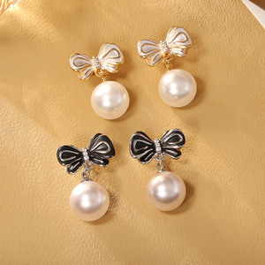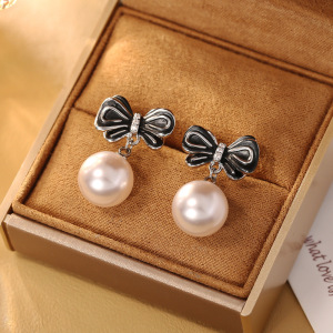 黑色滴油蝴蝶结玻璃珍珠耳钉(S925纯银针)