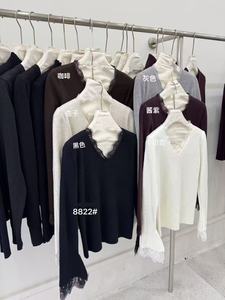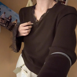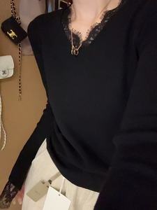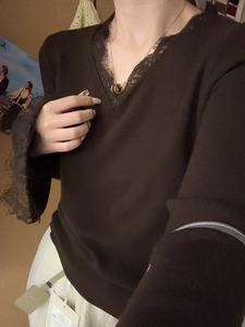 法式气质蕾丝拼接V领针织衫女秋冬超好看内搭毛衣喇叭袖打底上衣