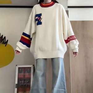 秋冬新款韩系撞色设计感圆领套头毛衣女宽松大码慵懒风上衣针织衫