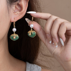 国风雅韵新中式复古显白竹绿平安锁珍珠耳环百搭高级感旗袍耳饰