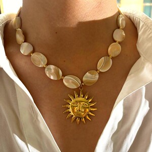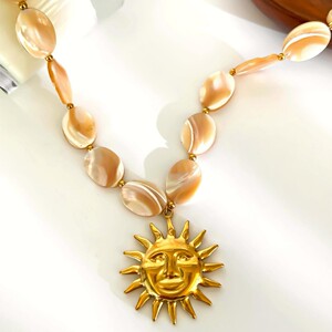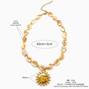 欧美时尚设计天然贝壳串珠不锈钢太阳吊坠女士个性项链轻奢项饰女