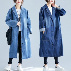 韩版大口袋牛仔衣外套女衬衫领长款风衣外套