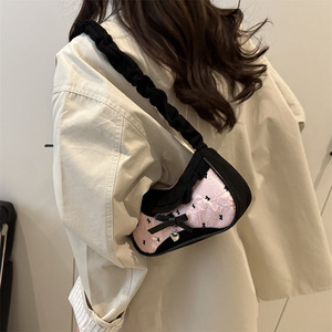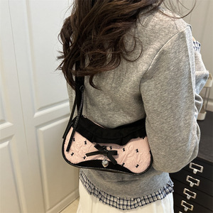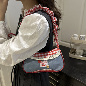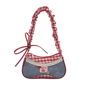 2025秋季新款格子布女式蝴蝶结波点撞色拼接牛仔手提单肩腋下包