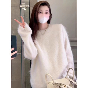 温柔水貂绒紫色圆领毛衣女秋冬外穿加厚宽松软糯慵懒风内搭针织衫