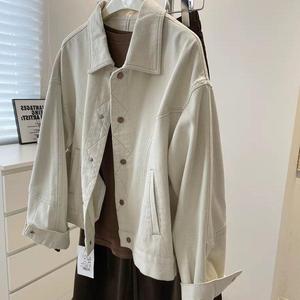 女装水洗斜纹棉百搭宽松牛仔外套女明线设计短款夹克上衣春米白色