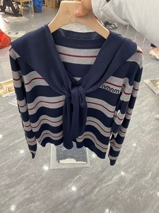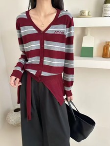 欧货时尚气质条纹针织开衫女2025秋装新款V领长袖毛衣外套送围巾