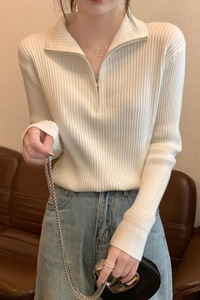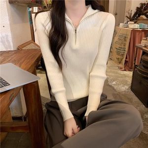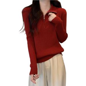 秋冬季新款翻领长袖打底针织衫上衣洋气法式感拉链毛衣女内搭