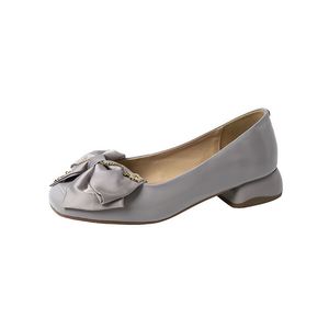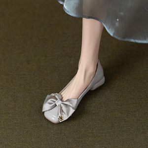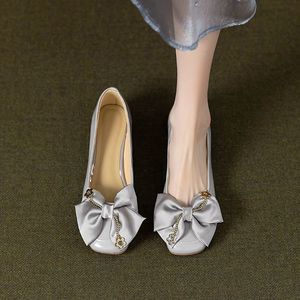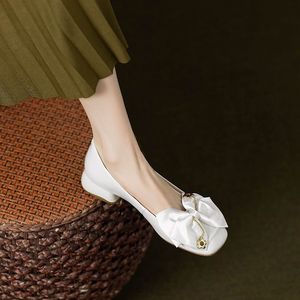 法式复古真皮方头蝴蝶结单鞋女2025春秋新款气质优雅浅口粗中跟鞋
