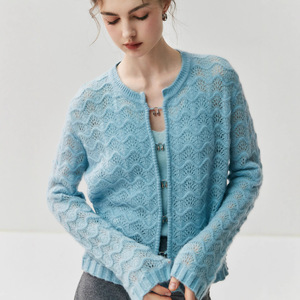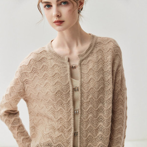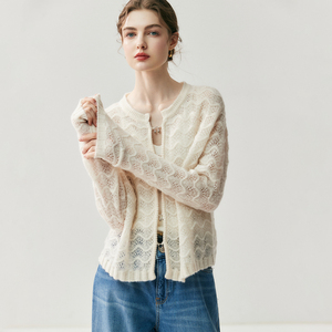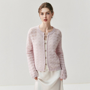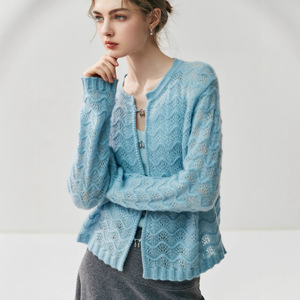 宽松显瘦丝绒山羊绒针织开衫短款2025秋冬圆领镂空女毛衣外套拉链