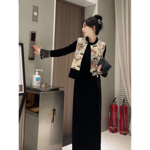 新中式国风早秋穿搭一整套端庄大气马甲黑色丝绒连衣裙两件套女装