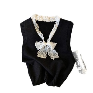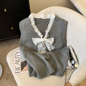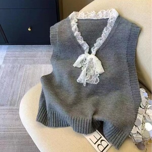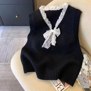 小香风蝴蝶结v领针织马甲女春秋新款花边小个子叠穿毛衣背心外穿