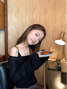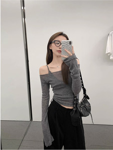 灰色露肩一字肩上衣女春季薄款短款针织衫修身内搭打底衫长袖t恤