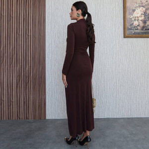 2025年秋季新款女装欧美亚马逊跨境外贸收腰棕色开叉优雅包臀长裙