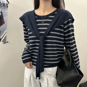韩版送围巾条纹针织衫女2025秋季新款时尚洋气宽松百搭减龄毛衣