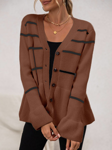 跨境欧美亚马逊TEMU速卖通秋冬条纹v领宽松新款针织长袖开衫女装