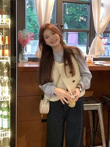 小香风羊羔毛马甲背心女早秋富家千金叠穿长袖条纹衬衫两件套气质