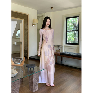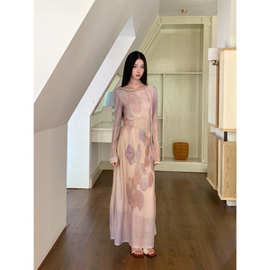 实拍现货现货网纱印花连衣裙女春夏显瘦长裙