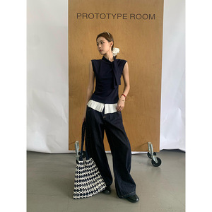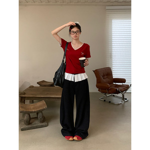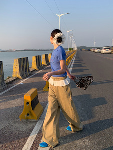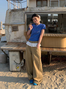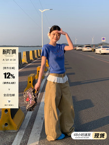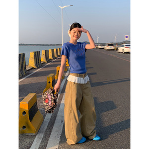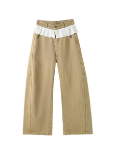 宋正恩卡其色洗水棉阔腿牛仔裤女夏季新款宽松蕾丝花边拼接长裤子
