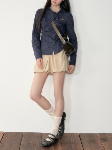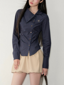 原创深藏青斜翻领复古格纹掐腰显瘦长袖衬衫衣女