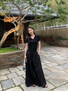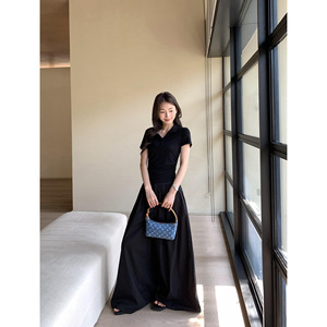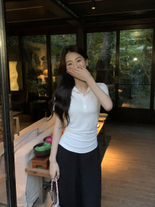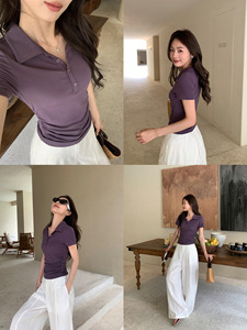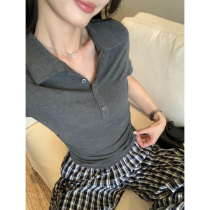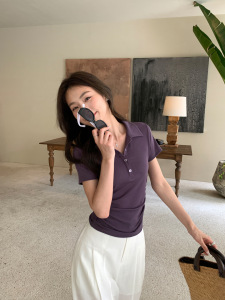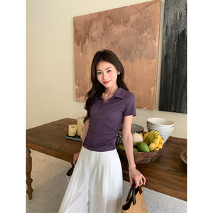 pusumede通勤polo衫 黑色短袖t恤女简约气质修身收腰短款天丝上衣