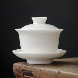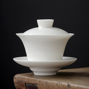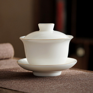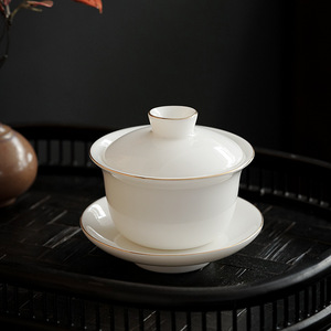 羊脂玉白瓷描金边三才盖碗茶杯功夫茶具敬茶碗纯白大号温润泡茶碗