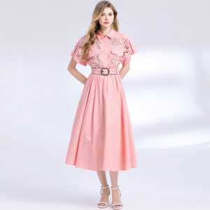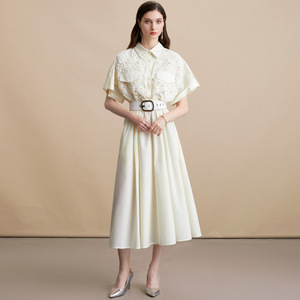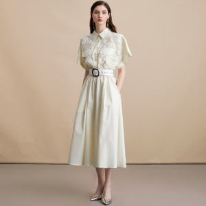 杏色赫本风高级感蕾丝衬衫连衣裙女2025夏新款收腰显瘦大摆裙