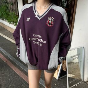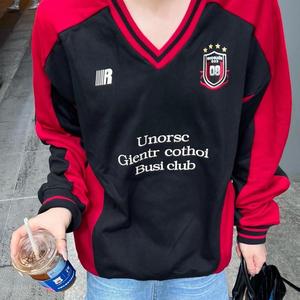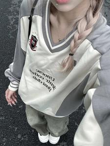 美式高街撞色领卫衣女春秋款学院风字母刺绣拼接运动上衣长袖