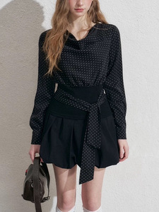 2025早秋新款时尚气质小众波点上衣荡领长袖黑色衬衫女黑色上衣