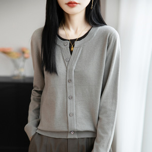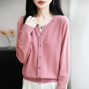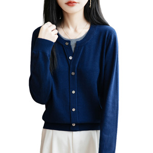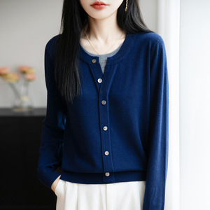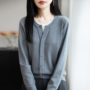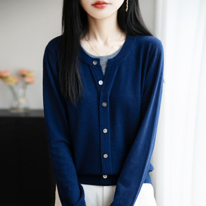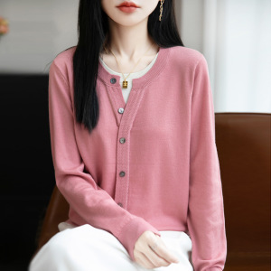 羊毛混纺2025秋冬新款女士宽松圆领拼色系扣假两件上衣打底针织衫
