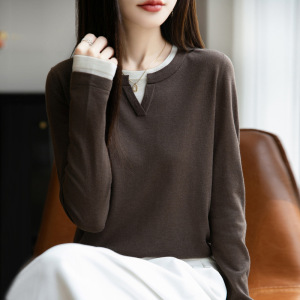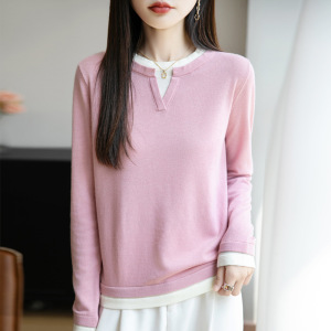 羊毛混纺2025秋冬女新短款宽松圆领拼色假两件套头上衣打底针织衫
